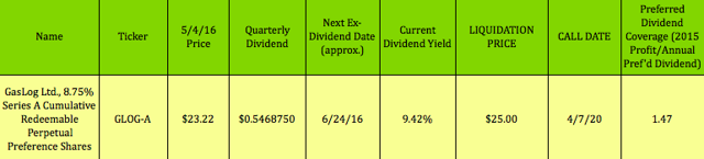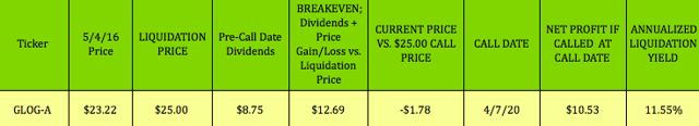 Liquidation Yield: Although this is a perpetual stock, GLOG has the right to redeem it beginning on 4/7/20 at $25. This table illustrates your yield and gains if you were to buy it now and GLOG buys it back on 4/7/20. This combo of $8.75 in future distributions and $1.78 in price gains would give you an annualized yield of 11.55%.