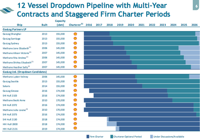 The future looks bright for GLOP - it has a dropdown pipeline of 12 vessels from general partner GLOG, all of which are on long-term contracts.