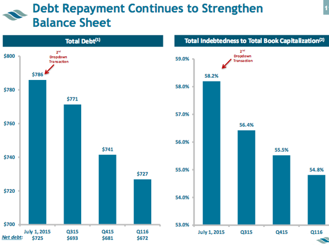 Paying Down Debt: Management keeps hacking away at the company's debt load, steadily strengthening GLOP's balance sheet each quarter. In Q1 2016,it utilized excess cash flow again to further reduce the total debt balances by $14.6M, including 10 million of an inter-company loan with GasLog Limited, which can be redrawn at any time. As it said on the earnings call, "this debt pay down is accretive to our distributable cash flow on a per unit basis."