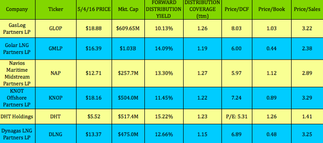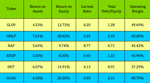 Valuations: We've added GLOP to this valuation table to compare it to these other shipping stocks that we've covered in recent articles: Navios Maritime Midstream Partners LP (NYSE:NAP), KNOT Offshore Partners LP (NYSE:KNOP), DHT Holdings (NYSE:DHT), Dynagas LNG Partners LP (NYSE:DLNG) and Golar LNG Partners LP (NASDAQ:GMLP).