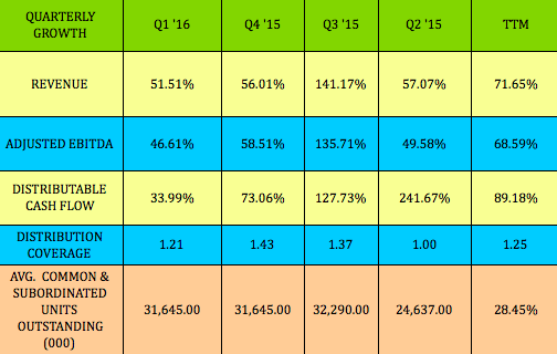 So, how badly did it affect coverage? It slipped to 1.21x, which is still a strong ratio. Looking at the year-over-year numbers and the trailing 12-month numbers, there are some heady percent gains in all categories, thanks to the addition of two dropdown vessels in Q3 2015.
