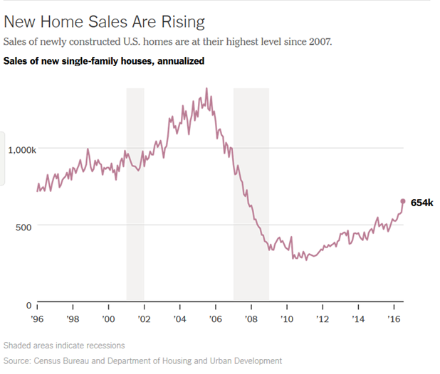 - New home sales beat expectations by a mile - SAAR of 654K versus expectations of 580. The NYT (finally) joins Calculated Risk in noting the rebound in the housing market.