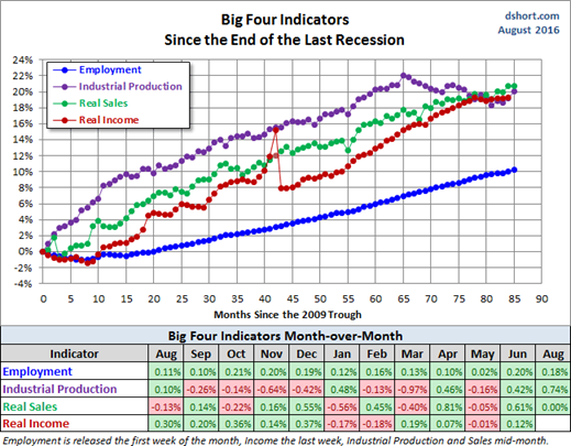 The ECRI has been dropped from our weekly update. It was not so much because of the bad call in 2011, but the stubborn adherence to this position despite plenty of evidence to the contrary. Those interested can still follow them via Doug Short and Jill Mislinski. The ECRI commentary remains relentlessly bearish despite the upturn in their own index. Here is Doug's latest update (including the recent retail sales data) of the Big Four indicators followed by the non-partisan, non-governmental NBER in dating recessions.