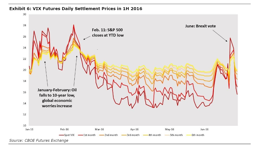Volatility derivatives. Trading volume has exploded in these products. Traders who are "scared witless" [TM OldProf Euphemism] read a blog post explaining that this is a great way to hedge. Hardly any realize how much the odds are stacked against them. Mark Melin's article at ValueWalk does a great job of explaining these issues. The chart below summarizes the key point - contango in the futures contracts. If you do not understand the significance of this, you need to do a lot more study before trading these products!