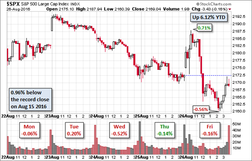 I always start my personal review of the week by looking at this great chart from Doug Short. The overall range is very narrow, with stocks remaining near record highs. It shows the effect from the Yellen speech, the Fischer comments, and the final verdict. It was all pretty muted. Doug has a special knack for pulling together all of the relevant information. His charts save more than a thousand words! Read his entire post where he adds analysis and several other charts providing long-term perspective.