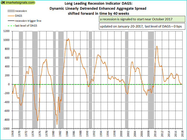 regularly analyzes Bob Dieli's enhanced aggregate spread, considering when it might first give a recession signal. Georg has been suggesting that the measure still shows a one-year led time. His most recent take has a wide time horizon, but an onset date of October (the chart below). Please note that Georg's other indicators are still "friendly."