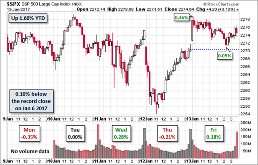 great chart from Doug Short. As has been the recent case, both the range and the weekly change were very small. Doug attributes the Friday pullback to an Inaugural Address that offered little for the wealthy. He offers more analysis in his commentary. (Personally, I do not find any of the moves big enough to merit discussion, but there was plenty of commentary).