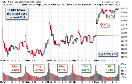 I always start my personal review of the week by looking at this great chart from Doug Short via Jill Mislinski. She notes that the week's gain was all from early action on Friday. Some attributed this to the employment report, but the timing is more consistent with a reaction to Trump actions on Dodd-Frank.
