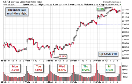 I always start my personal review of the week by looking at this great chart from Doug Short via Jill Mislinski. She notes the new high and the overall gain of 0.81% for the week.