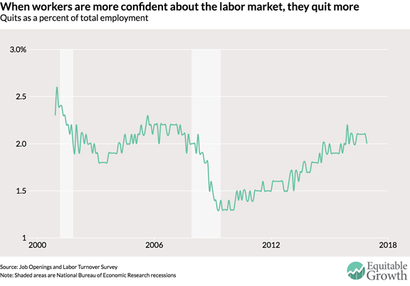 - The quit rate is seen as a measure of health, since it reflects those who voluntarily leave jobs, expressing confidence in other opportunities. There is a nice discussion of JOLTS and several charts from Nick Bunker.