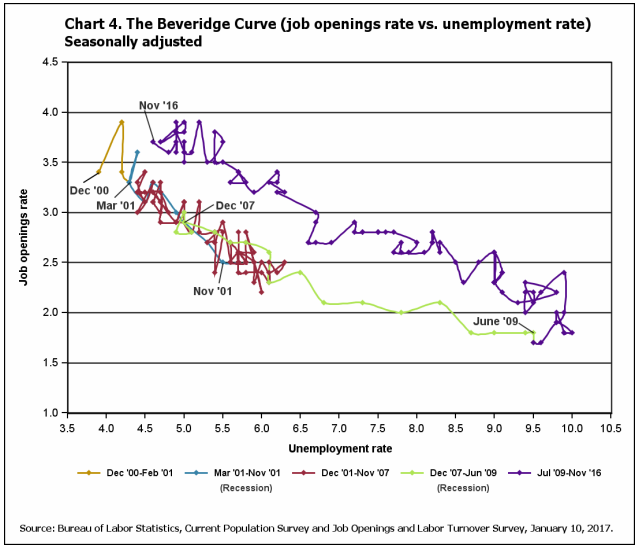 - The Beveridge Curve is the most important interpretation, emphasized by Yellen. What we really want to know is the tightness of the labor market. Here is a nice explanation from 2012, noting what is needed for labor market improvement and the general counter-clockwise movement after a recession. (Readers looking for a Silver Bullet Award might want to check out the very lame interpretation at ZH, where one of the Tylers only discusses the gap, not the trend or slope. The most recent update is a month old, from the BLS.
