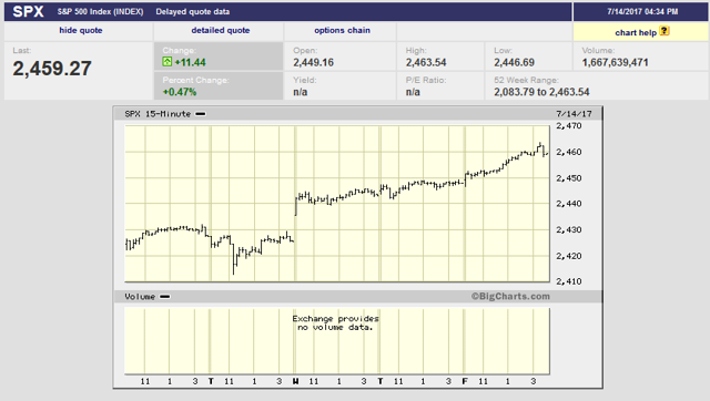 I always start my personal review of the week by looking at a chart of market price moves. The Wednesday pre-market release of Chair Yellen’s Congressional testimony was the most notable feature. The market gained 1.4%, reaching a new all-time high.