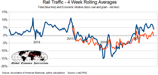 - Rail traffic declined. Steven Hansen (GEI) analyzes the data with an important adjustment for coal and grain.