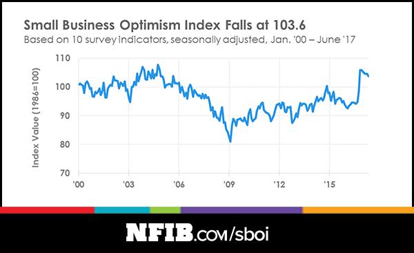 - Small business optimism dropped from the recent peak. The NFIBattributes the decline to a stalled Trump agenda.