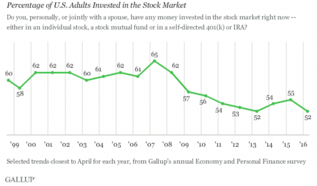 - The percentage of people invested in stocks is at a low.