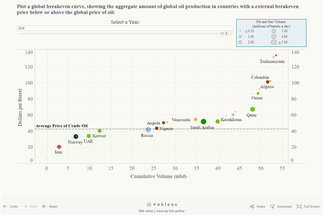 Many readers share my interest analyzing data. The new interactive tool from the Council on Foreign Relations lets you analyze the breakeven price point for oil exporting countries. There are multiple approaches and features. I cannot do justice to it in a static chart, but here is an example.