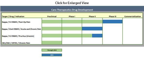 As stated above, Cara's primary drug candidate is CR845 which is in mid to late stage trials for treatments in three distinct areas. Numerous milestones should be hit in 2016 which will be discussed in a section below. CR845 primary benefit is that unlike currently marketed opioids, this new compound does not produce inhibition of intestinal transit (ileus), does not induce life-threatening respiratory depression, nor does it elicit signs of addiction or euphoria. This is a key point as opioid addiction has recently become a national focus as well as a theme in various primaries this election season.