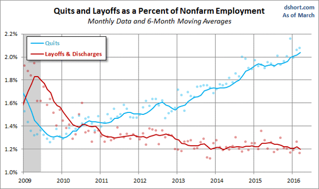 Doug Short illustrates the strength of the voluntary quit rate versus layoffs.