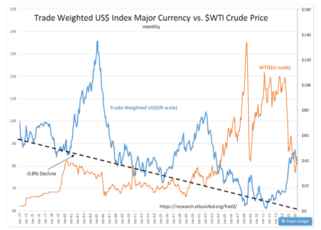 Most of the discussion today centers on whether it is oil or the US$ which is driving the correlation. This is like a discussion of which comes first, the 'Chicken' or the 'Egg'. My perception is that the main driver in changing global trade balances. Even if one could unravel all the inputs we have on global trade, the data itself is incomplete with a number of nations treating global trade figures as state secrets. Global trade balances impact prices and currencies long term to produce the correlations seen in the chart from Jan 1973.