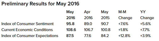 - The Michigan sentiment index beat both last month and also expectations by a wide margin - 95.8 versus about 90. This survey gets timely information about job creation and spending that we do not see elsewhere. As always, I recommend looking at the best chart (and also great discussion) from Doug Short. This month I also recommend checking out the Michigan site. You can find long-term charts and a great explanation of the method. Here is the summary of the key forward-looking data: