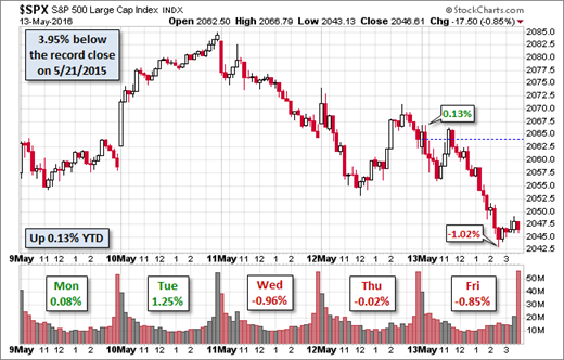 Once again the early strength faded at the end of the week. Doug Short captures the story of the decline, the third straight) with his excellent weekly chart. (With the ever-increasing effects from foreign markets, you should also add Doug's World Markets Weekend Update to your reading list).