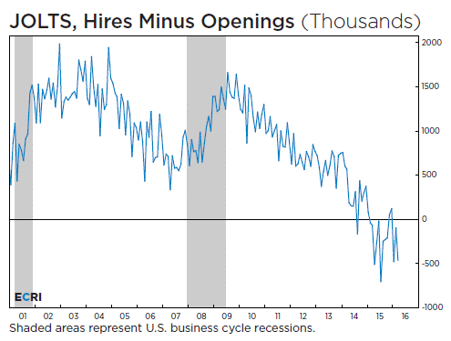 - The job market improved, as indicated by the JOLTs report. I often describe this as the most misunderstood data release. Too many people try to use it to analyze net job growth, something better done with various other sources. The ECRI has a new indicator (something about purple animals) subtracting actual hires from job openings, and somehow inferring weakness if this difference increases. They seem to be on a mission to find something negative in the data. Here is their key chart: