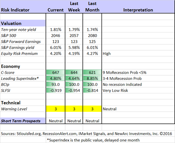 Whether a trader or an investor, you need to understand risk. I monitor many quantitative reports and highlight the best methods in this weekly update. I recently made some changes in our regular table, separating three different ways of considering risk. For valuation I report the equity risk premium. This is the difference between what we expect stocks to earn in the next twelve months and the return from the ten-year Treasury note. I have found this approach to be an effective method for measuring market perception of stock risk. This is now easier to monitor because of the excellent work of Brian Gilmartin, whose analysis of the Thomson-Reuters data is our principal source for forward earnings.