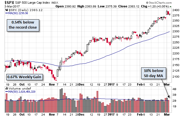 I always start my personal review of the week by looking at this great chart from Doug Short via Jill Mislinski. She notes yet another record close based on the week’s gain of 0.67%. We can also see the gap opening after the Presidential Address to Congress.