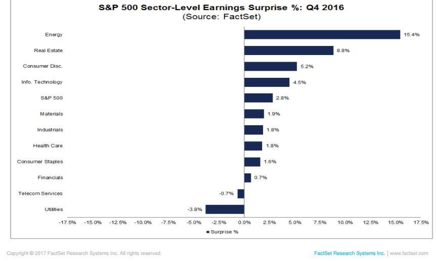 - Earnings news was positive. Brian Gilmartin emphasizes the favorable trend in estimate revisions. FactSet reports that the earnings and revenue beat rates are slightly lower, but outlook is stronger. Here is an interesting chart of surprises by sector.