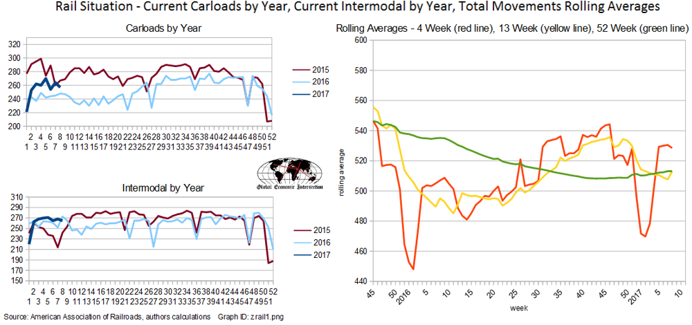 - Rail traffic in February was 4.2% higher than a year ago. Steven Hansen takes the look at the data we have come to expect, including various moving averages and trends. Read the whole post, but this chart captures some key points, especially the improvement over the last two years.