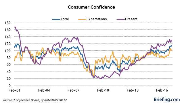 - Consumer confidence spiked to 114.8, a post-recession high. Briefing.com covers this series.
