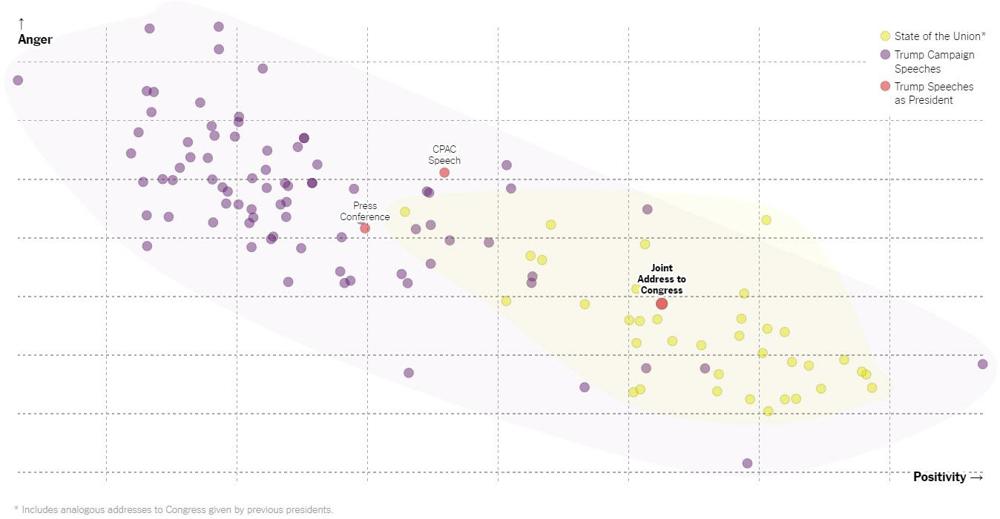 - President Trump’s speech was very well-received. Most preview articles mistakenly emphasized the need for specifics. Commentators right after the speech did the same. My own preview did not provide advice on what to go out and trade right after the speech. Instead, I drew upon experience and the current policy environment to highlight the key element – the potential for compromise. This chart shows the dramatic shift in this Trump presentation, more like SOTU speeches than nearly anything else he has done. (The Upshot)