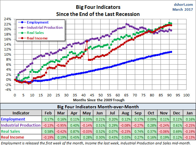 Doug Short: The World Markets Weekend Update (and much more). His Big Four chart is the single best method to monitor the key indicators used by the National Bureau of Economic Research in recession dating.